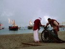Någonstans ute i natten glider skeppen ljudlöst fram, in mot stranden. Ingen kan se dem. Lyktor tänds runt borgen som badar i ljus, kyrkklockor ringer, ropen alarma!, alarma! assesinos! rullar över stranden och nu tågar försvarsarmén in: knektar i gult och rött med musköter över axeln som marscherar till virvlande trummor, ställer upp sig på led och ger eld rakt ut i mörkret.