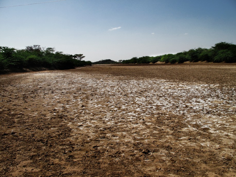 Uttorkad flod i staden Lodwar, Turkana-provinsen, Kenya. När regnperioder uteblir måste djur och människor gå allt längre för att hitta mat och vatten.