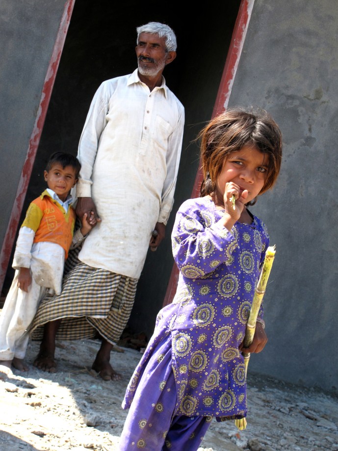 En familj står framför sitt nya hus som de fått hjälp med att bygga upp av en biståndsorganisation. Punjab-provinsen, Pakistan.