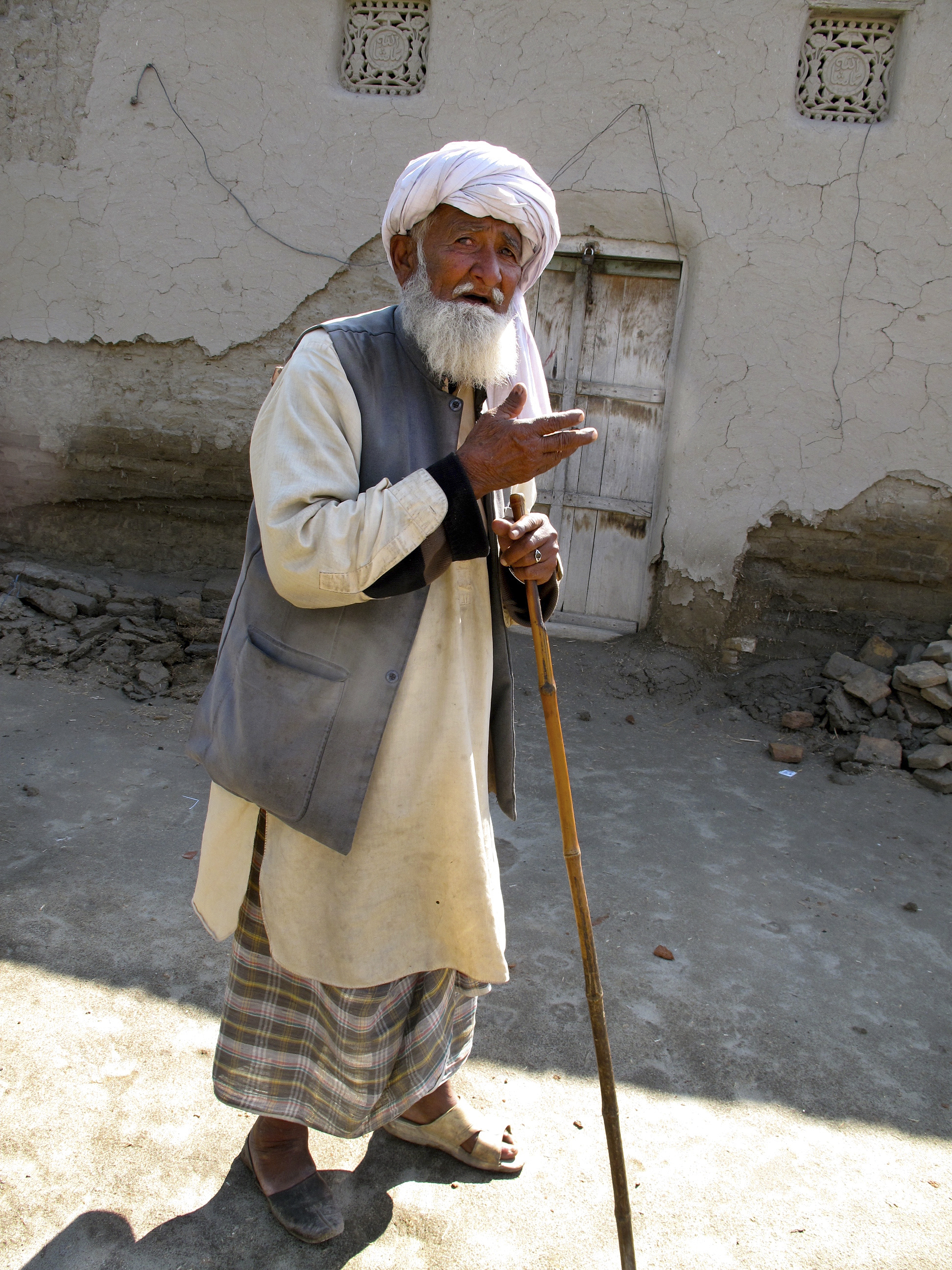 Muhamed Baksh står framför sitt förstörda hus i byn Tar Poor. Vattennivån syns på väggen bakom honom. Han är 80 år och fick fly med sin fru Mai Karimo flera kilometer till ett tältläger. Punjab-provinsen, Pakistan.