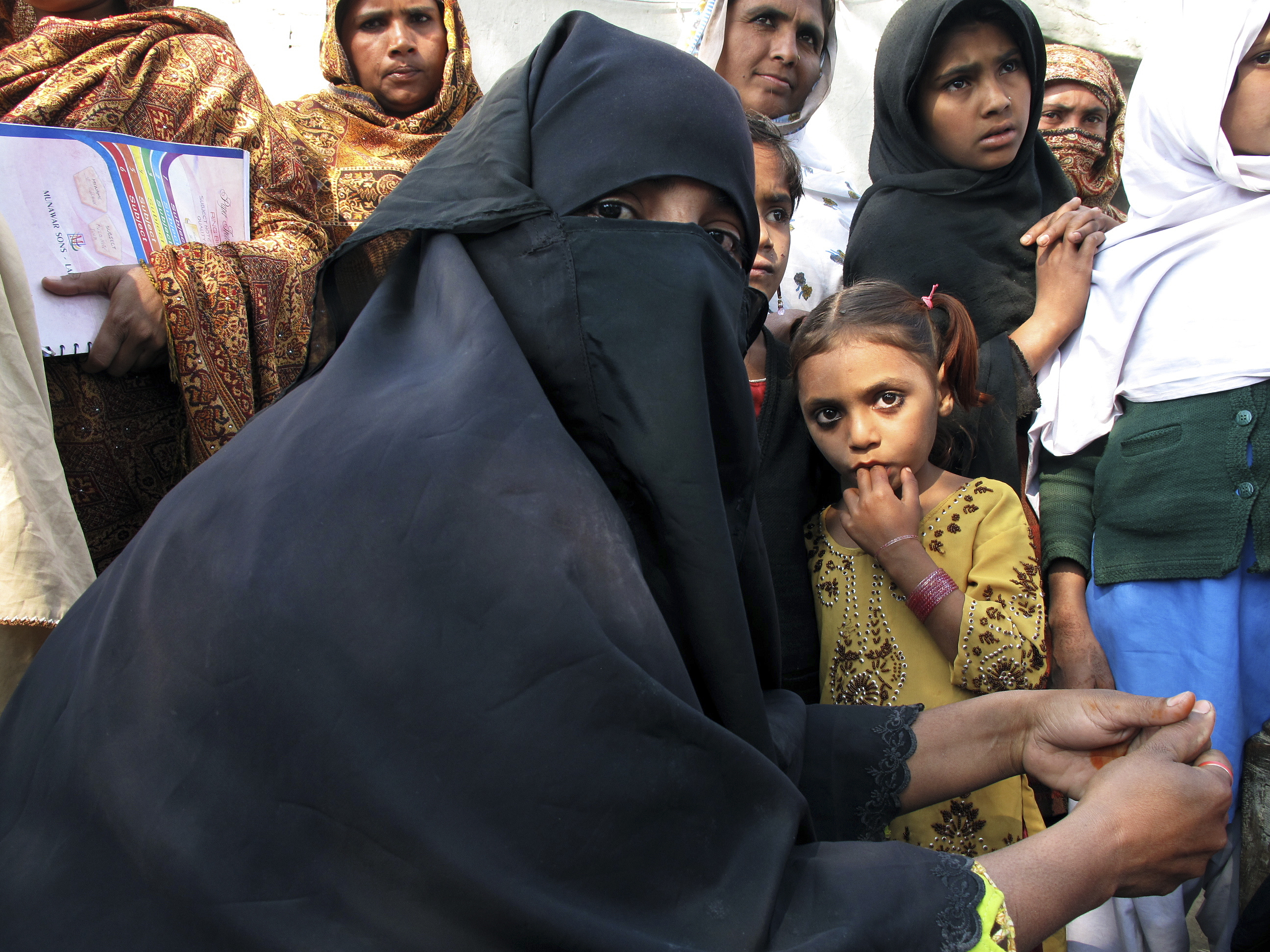 Byn Tar Poor i Punjab-provinsen drabbades hårt av översvämningen sommaren 2010 och invånarna flydde till tältläger flera kilometer bort. Nu har familjerna återvänt och bor i tält i väntan på att kunna bygga upp sina hus. Flera gånger i månaden träffas kvinnorna för ”empowerment”-möten så att de kan vara delaktiga i återuppbyggnaden. ”Våra män såg hur starka vi kvinnor var under katastrofen, vi kvinnor var faktiskt starkast”, säger kvinnan i svart niqab. Punjab-provinsen, Pakistan.