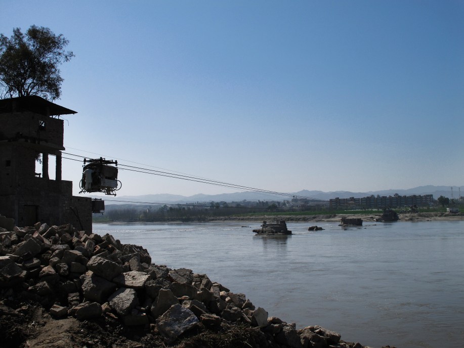 Linbanan går från byn Pir Sabaq över till den större staden Nowshera. Rester av bron som inte är återuppbyggd sticker upp från vattnet. Kyber Pakhtunkhwa-provinsen, Pakistan.
