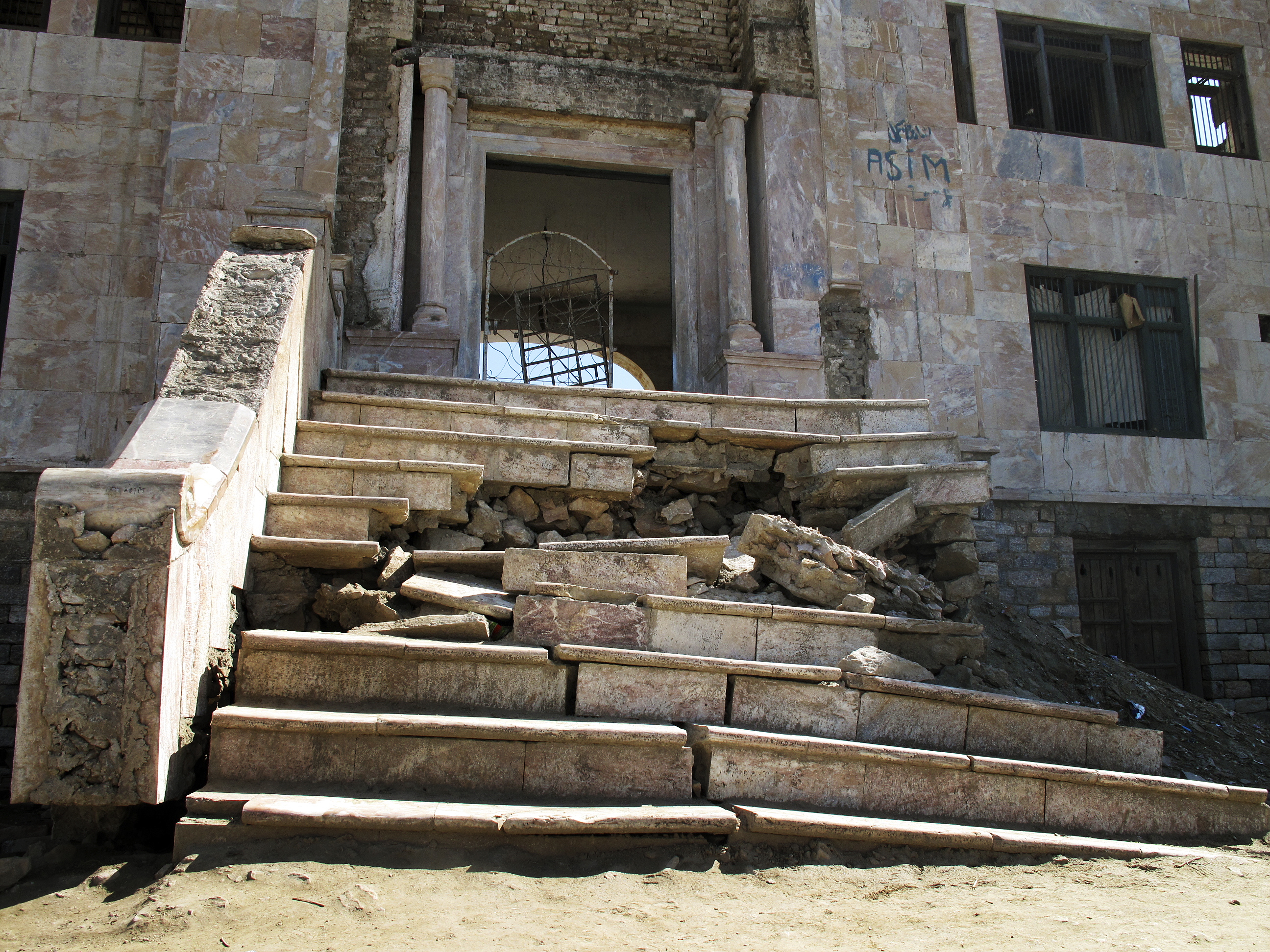 Skola i byn Pir Sabaq totalförstördes av översvämningen. Här skolans trappa som är byggd av traktens marmor helt förstörd. Kyber Pakhtunkhwa-provinsen, Pakistan.