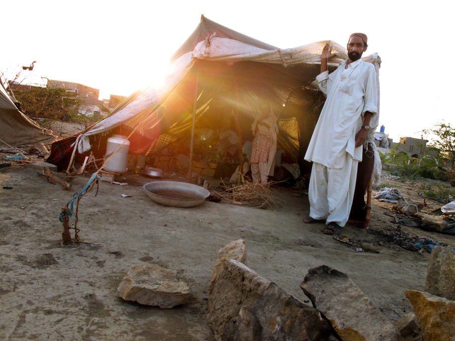 Far och dotter vid ett tält i lägret Tent City utanför Karachi i södra Pakistan. De tusentals som fortfarande lever här har inget att återvända till i sina hembyar och ser ingen annan lösning än att bo kvar i tält. Utanför Karachi, Pakistan.