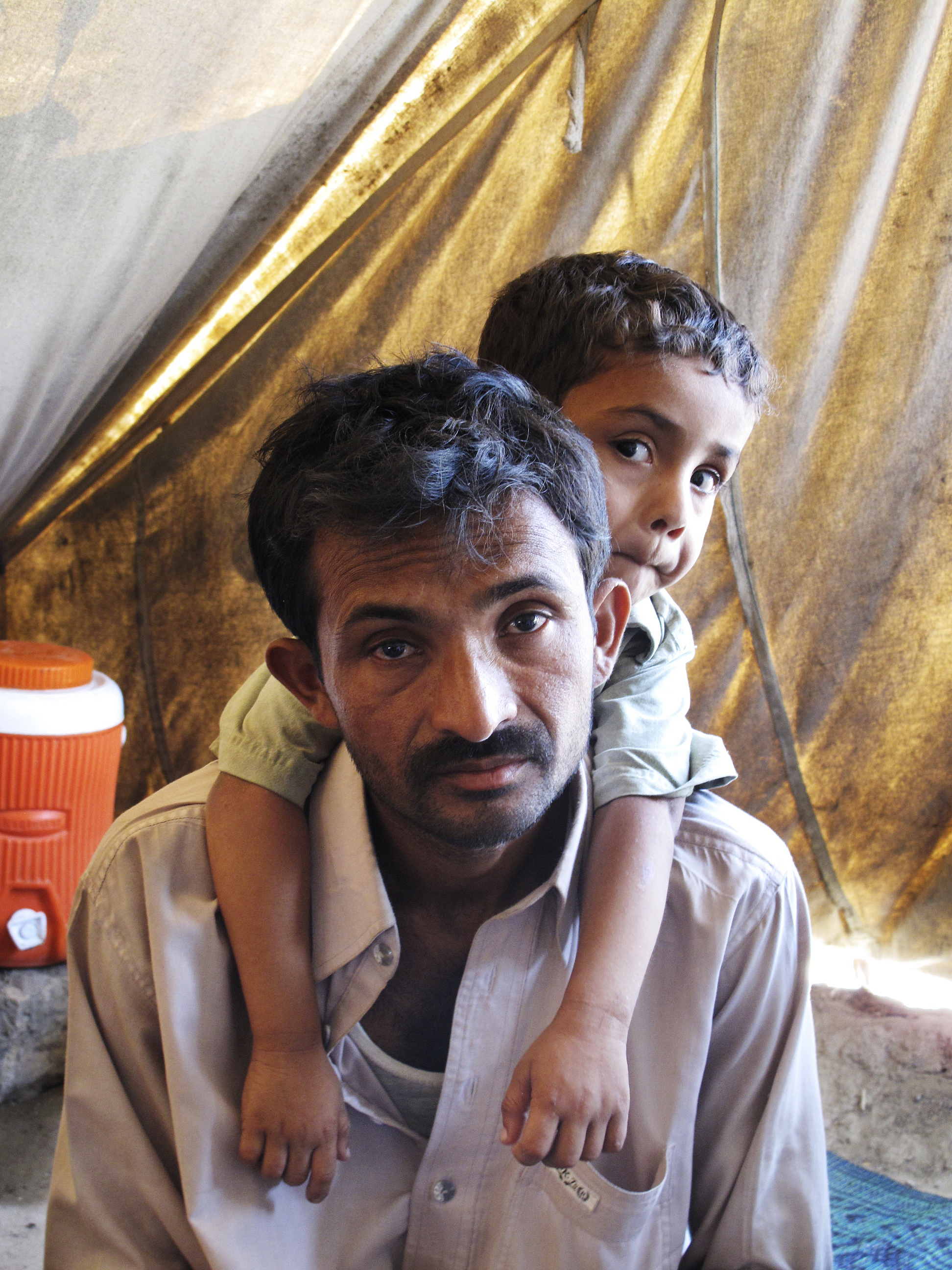 4-årige Nazir blir lätt uttråkad i det lilla tältet i Tent City som under sommaren är för het och under vintern för kall. Här med sin pappa Muhamed som sörjer att han inte har möjlighet att ge sin son några leksaker. Utanför Karachi, Pakistan.
