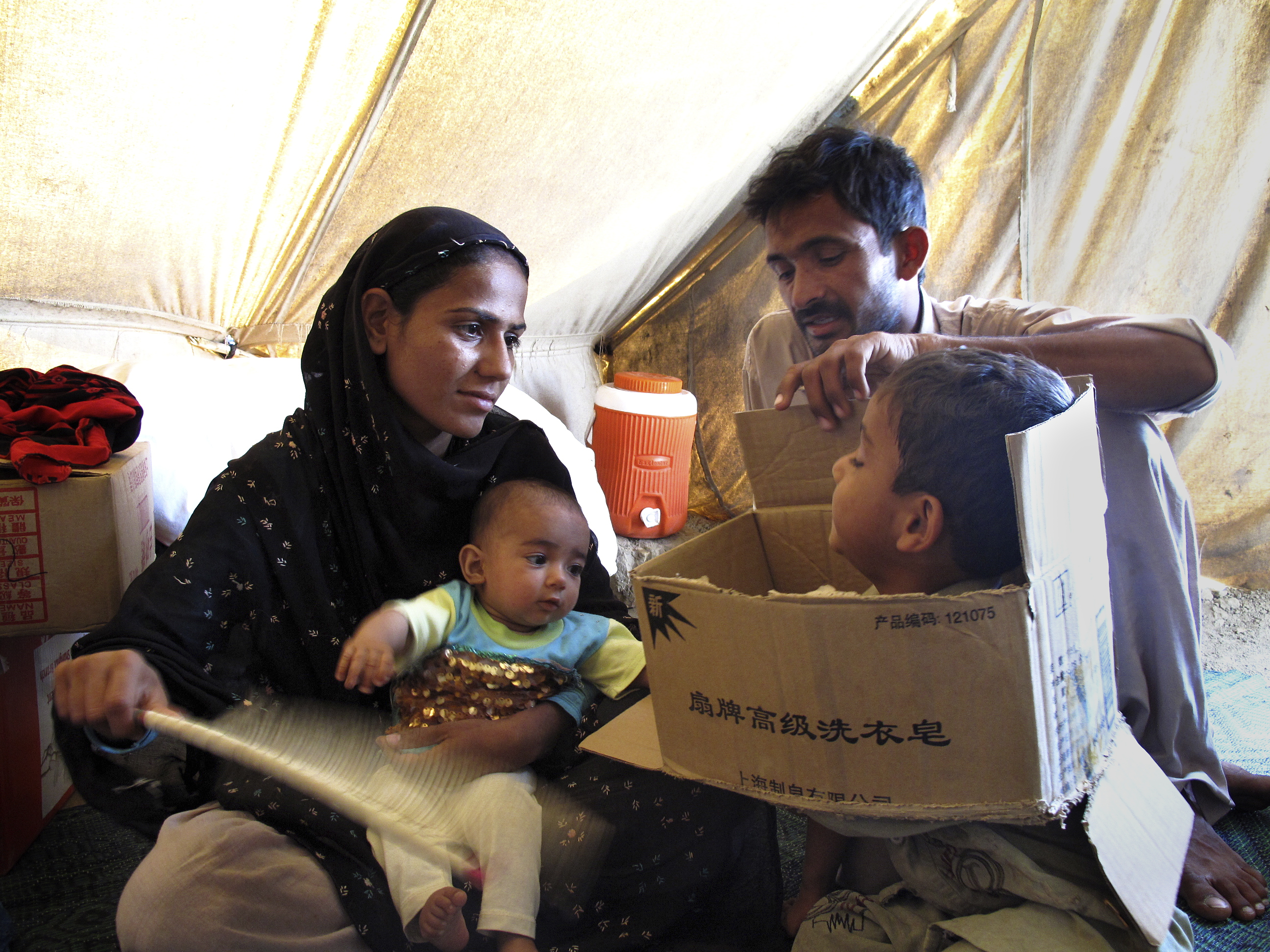 Razia och Muhamed Varis har under flera månader bott i ett litet tält i Tent City med sin 4-årige son Nazir och sjumånaders dotter Bisma. Razia var höggravid när de flydde från sin by och Bisma föddes under omständigheter i lägret som ligger utanför Karachi, Pakistan.